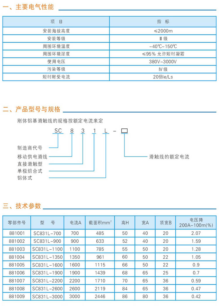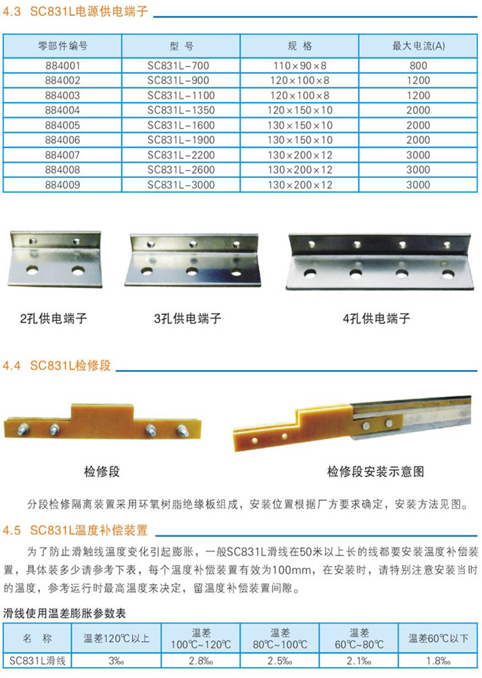 滑觸線的安裝支架一般為3m一個,特殊情況亦可采取加強措施適當(dāng)擴大距離,三根滑觸線之間的相間距離為400mm,如為低阻抗滑觸線,相間距離可擴大到450mm。