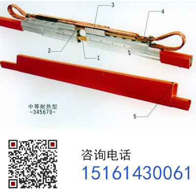 ? 膨脹段是根據(jù)滑觸線在不同溫度環(huán)境工作的情況下,對(duì)滑觸線在熱脹冷縮時(shí)所產(chǎn)生的直線形變(型? 材擠壓對(duì)頂)和冷縮時(shí)(型材收縮)而造成斷電而設(shè)計(jì)的。它由兩個(gè)可移動(dòng)段與滑觸線干線本體直截串聯(lián)連接而成,其基本原理為:它由相對(duì)的靜態(tài)滑片和動(dòng)態(tài)滑片疊插組成一個(gè)與滑觸線本體截面相吻合的過(guò)渡體,在滑觸線環(huán)境溫度變化時(shí)可自由地進(jìn)行直線移動(dòng)。由于靜態(tài)滑片和動(dòng)態(tài)滑片疊插后,無(wú)論怎樣伸展與收縮,它都能夠給集電器的電刷一個(gè)直線過(guò)渡的平面,從而克服了較早時(shí)期膨脹接頭而帶來(lái)的膨脹范圍窄,集電器電刷跨越困難而造成斷電,接觸面變小而跳火等故障。由于靜態(tài)滑片和動(dòng)態(tài)滑片兩端與滑線本體直截連接后,同時(shí)又設(shè)置兩根滑動(dòng)導(dǎo)桿將靜態(tài)滑片和動(dòng)態(tài)滑片穿插導(dǎo)向,因此,它具有良好的同軸度。與此同時(shí),在靜態(tài)滑片和動(dòng)態(tài)滑片兩端的上方還設(shè)置兩根與滑接片相并聯(lián)的軟電纜,從而穩(wěn)定和增加該膨脹段的載流量,使整個(gè)系統(tǒng)不致于因膨脹段的設(shè)置而影響整線額定載流量 .膨脹段的可伸縮范圍可在 0~200mm之間調(diào)節(jié),可以吸收滑線導(dǎo)軌本體材料為鋁、銅,膨脹點(diǎn)距離150米/段、周邊環(huán)境溫度-40℃~+115℃時(shí),所產(chǎn)生膨脹系數(shù)而引發(fā)的伸縮距離,并使集電器能順暢通過(guò)而不影響其供電質(zhì)量。